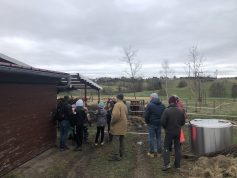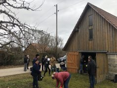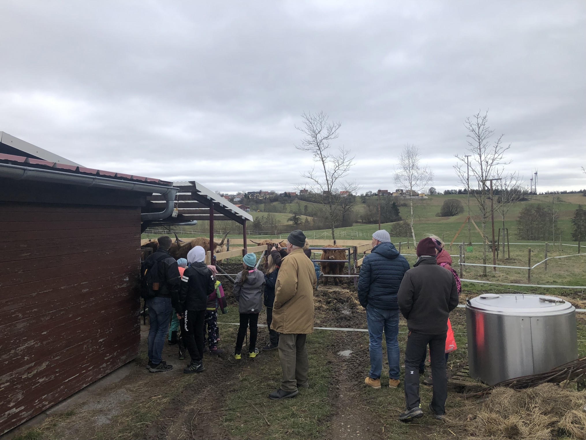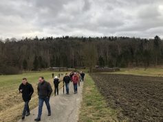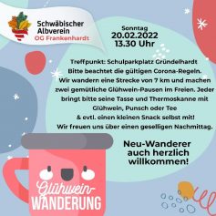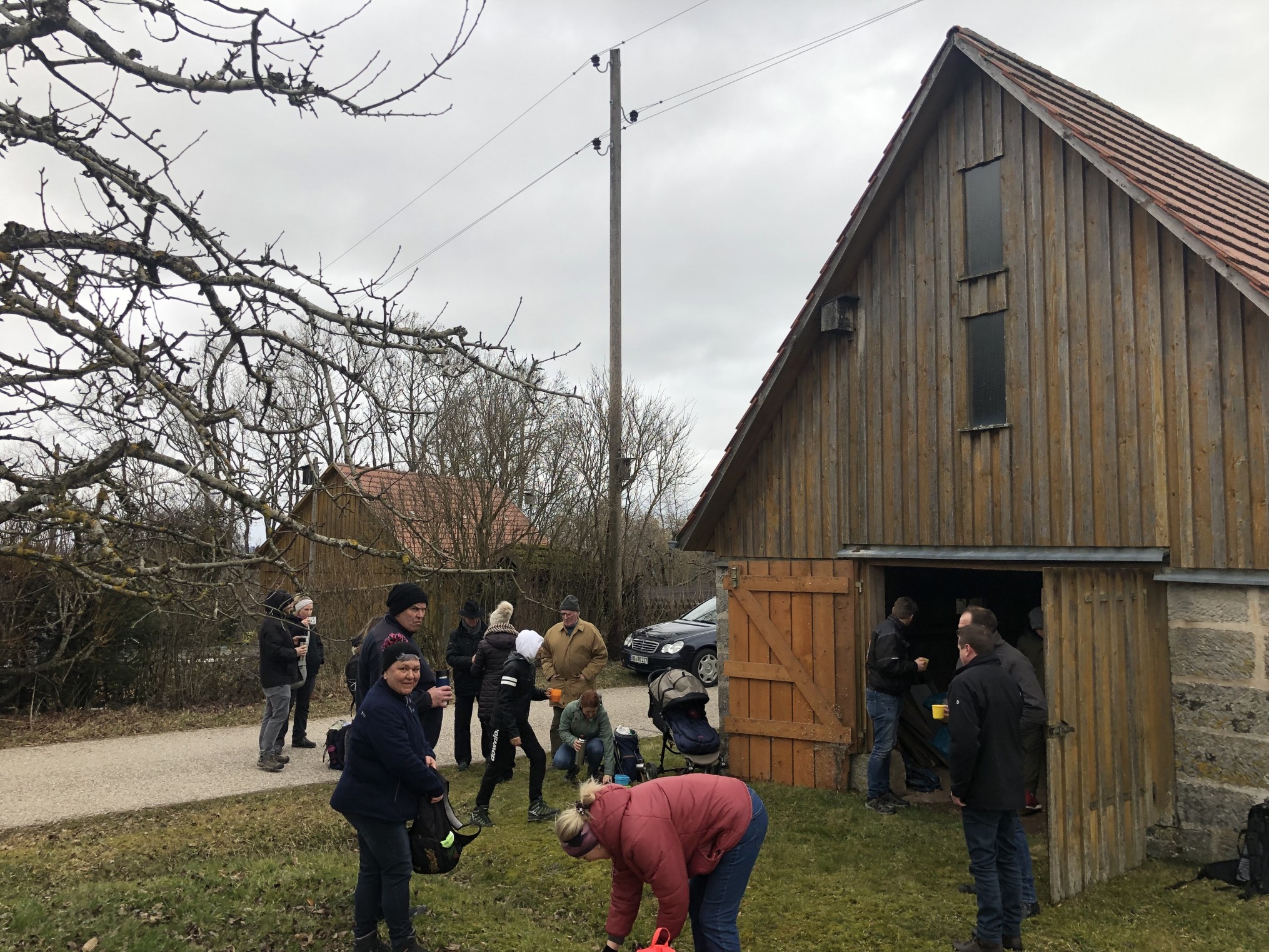 Am Sonntag den 20.02.2022 fanden sich am Gründelhardter Schulhof 25 Erwachsene und 9 Kinder ein um gemeinsam den Nachmittag mit einer Glühweinwanderung zu verbringen. Der Weg führte uns vom Parkplatz den Schulweg hinunter auf die Gaildorfer Straße, der wir bis Ortsausgang Gründelhardt folgten und auf die Hellmannshofer Straße abbogen. Hier mussten wir zum ersten mal gegen den Wind ankämpfen, kamen aber ohne Probleme auf der Kuppe an. Von dort ging es über Feldwege Richtung Reishof. Wir nahmen kurz vor Reishof eine kleine Abkürzung über die Wiese, so dass wir ohne auf der Straße zu gehen, sicher am Schafhaus Reishof ankamen. Hier machten wir unseren ersten Stopp und stellten uns im Schafhaus unter. Klaus Schüller konnte uns hier ein paar Details und Wissenwertes zu dem ehemaligen Schafhaus berichten. Das „Schafhaus“ bei Reishof wurde in den Jahren 1882 bis 1884 von der damaligen „Realgemeinde Reishof“ zusammen mit einem Armen- und Kesselhaus erbaut. Das Armen- und Kesselhaus existieren jedoch nicht mehr. 1925 wurde die „Realgemeinde Reishof“ aufgelöst und in die bürgerliche Gemeinde Honhardt eingegliedert. Seit 1925 wurde das Schafhaus überwiegend als Abstellraum für landwirtschaftliche Geräte genutzt. Der Pachtpreis hierfür betrug damals pro Jahr 10 Reichsmark. Alte Bürger in Reishof erinnern sich auch an eine zeitweilige Nutzung durch einen Wanderschäfer. In alten Flurkarten wird das Schafhaus auch als „Brechhaus“ bezeichnet, was auf eine weitere Nutzung als Flachsbrechhütte schließen lässt. Zur Erhaltung als historisches Kulturgut wurde das baufällige Schafhaus 2008 von der Gemeinde Frankenhardt erworben und umfangreich und fachgerecht saniert. Die Kinder erstaunten: „Hier hat jemand zusammen mit seinen Schafen gewohnt?“ Nach ein paar Gesprächen und der einen oder anderen Tasse Glühwein setzten wir unsere Wanderung fort. Ein kleiner weiterer Halt ergab sich Richtung Vorderuhlberg, wo wir prächtige Highland Rinder bestaunten. Die Imposanz der Tiere fesselte nicht nur die Kinder. Nun ging es leicht bergauf, durch ein kleines Waldstückchen, als wir da durch waren, blies uns der Wind ganz schön entgegen. Nach ein paar Minuten waren wir dann in Vorderuhlberg. Dort legten wir eine zweite Rast ein und konnten uns in den Windschatten der Brechhütte stellen. Auch ein Versorgungsfahrzeug des Albvereines fan sich ein und brachte Punsch und Glühwein Nachschub. In der Brechhütte wurde früher der Flachs gebrochen, dessen Fasern man für die Herstellung von Leinen brauchte. Weil es beim Dörren immer wieder zu Bränden kam, baute man die Brechhütte am Ortsrand. Flachs oder Leinen bildete seit dem Spätmittelalter neben Schafwolle den Hauptrohstoff für die Herstellung von Textilien. Der Anbau und die eigenhändige Verarbeitung von Flachs gehörten zu den traditionellen Tätigkeiten der Dorfbevölkerung in der vorindustriellen Zeit. Nach ausgiebigen Gesprächen und Glühwein ging es für uns dann fast nur noch bergab. In Windeseile waren wir schon wieder in Hellmannshofen und kurz darauf zurück am Startpunkt in Gründelhardt.