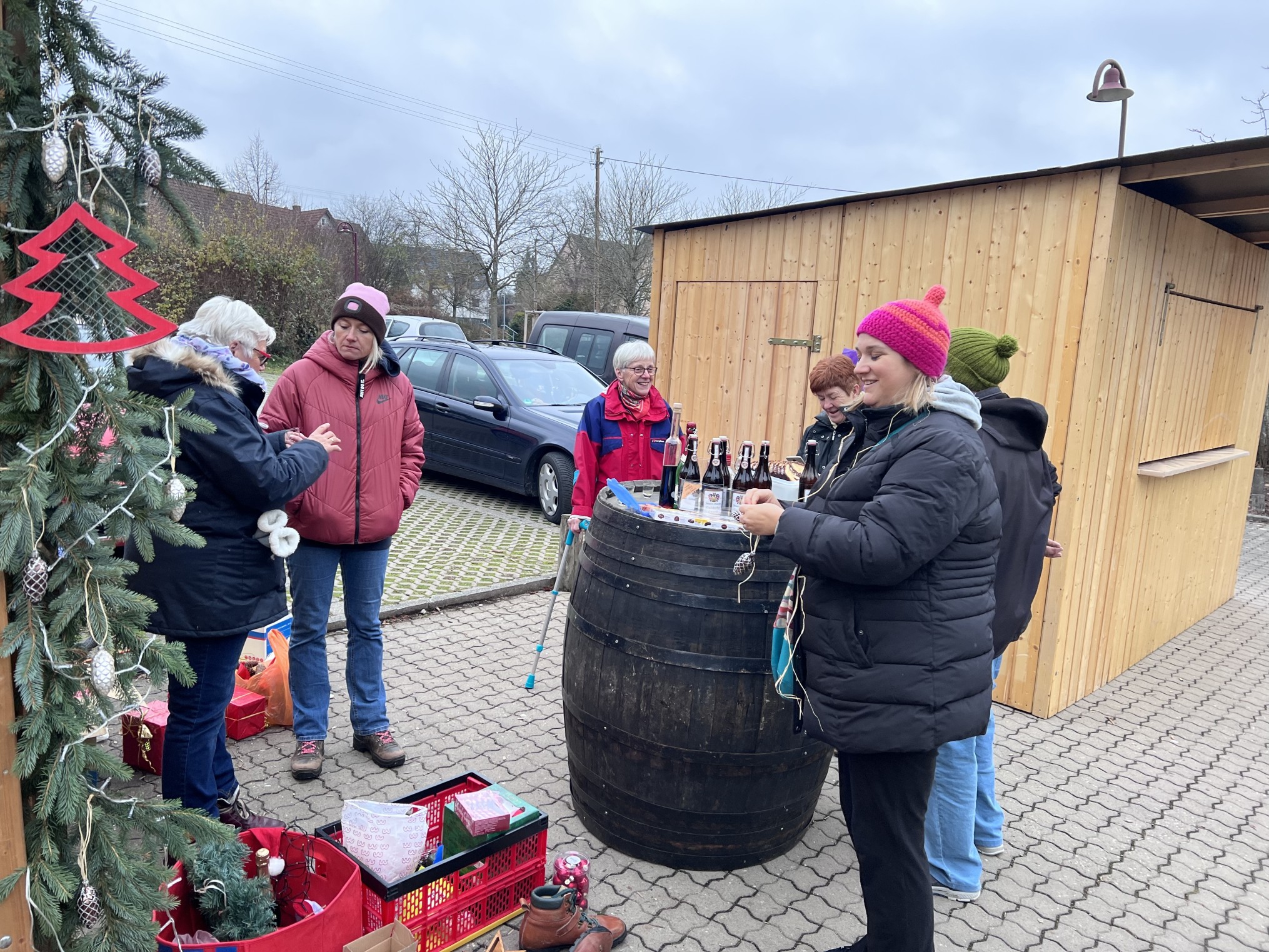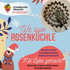 Traditionell, am 3. Advent, haben wir wieder am Gründelhardter Weihnachtsmarkt auf dem Schulhof teilgenommen. Wie immer gab es die berühmt berüchtigten Rosenküchle, sowie Schmalz-, Käse- und Veggiaufstrichbrote. Das orginale Holzofenbrot wurde wieder extra von Walter für den Weihnaqchtsmarkt gebacken. Frischer ging es nicht, alle waren begeistert. Den Rosenküchleteig, hat Franz uns gemacht. Seine jahrelange Erfahrung war uns sehr wichtig, die sollen ja wie immer perfekt werden. 120 Eier fanden im Teig ihre Bestimmung. Ein voller Erfolg. Es kamen viele, die sagten, dass sie nur wegen den Rosenküchle des Albvereins gekommen sind, da sie sich das ganze Jahr darauf freuen.