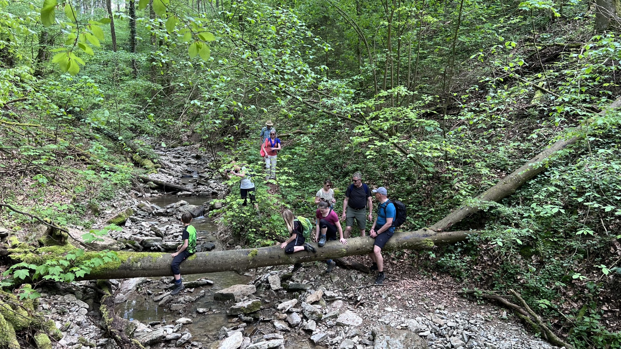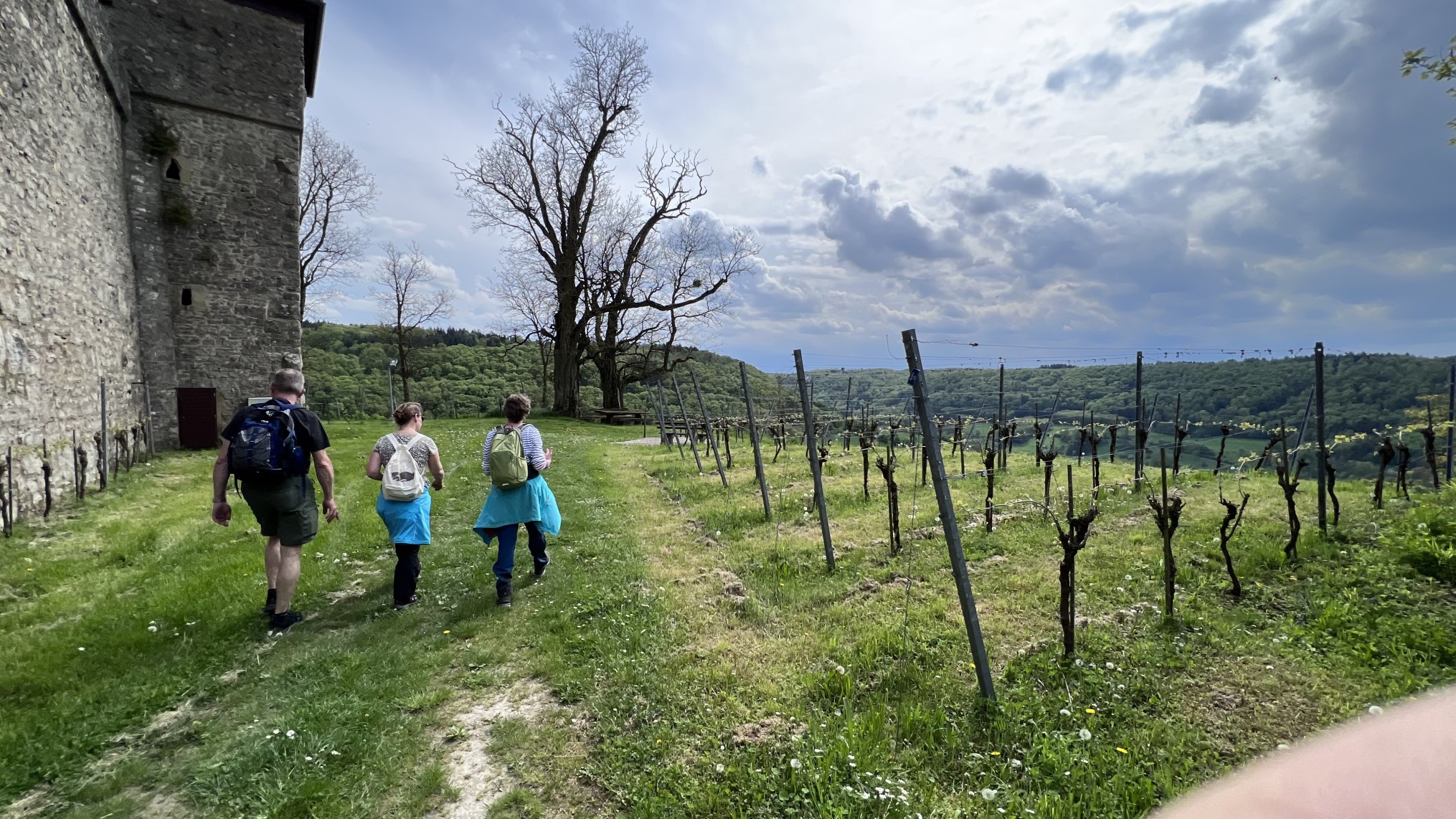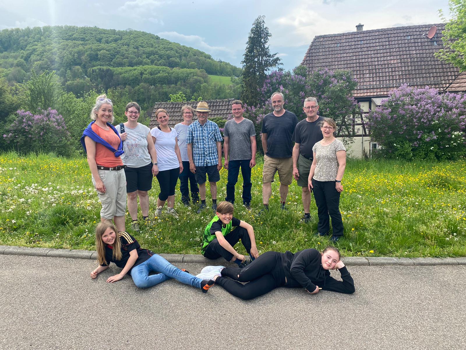 Am Sonntag den 7. Mai trafen sich interessierte Wanderer am Schulparkplatz in Gründelhardt. Das Ziel? Eine Überraschung, denn es war eine „Surprise Wanderung“. Deshalb freute es uns sehr, 10 Erwachsene und 3 Kindern begrüßen zu dürfen. Unser Wanderführer Walter gab dann die ersten Details der Ganztageswanderung bekannt. Es wurden Fahrgemeinschaften gebildet und sich auf den Weg nach Kocherstetten gemacht. Dann ging es recht schnell. Die Autos wurden geparkt, die Wanderstiefel angezogen und dann gab es kein halten mehr. Wir wanderten los. Zuerst den Berg hinunter, wo wir den Kocher überquerten um dann ein Stück auf dem Kocher-Jagst Radweg entlang nach Steinkirchen zu wandern. Hier machten wir, am dortigen Grillplatz eine kurze Rast und packten unser Rucksackvesper aus. Die Sonne zeigte sich entgegen der Wettervorhersagein voller Pracht und so wurde die Sonnencreme ausgepackt und die ersten kurzen Wanderhosen angezogen. Frisch ausgeruht, gestärkt und kleidungsoptimiert, brachen wir auf, zum schönsten Teil unserer Strecke. Von Steinkirchen ging es den Berg hinauf. An Weilersbach, Sommerberg und Winterberg vorbei. Etwas unterhalb von Tierberg konnten wir einen herrlichen Panoramablick in das Kochertal werfen, bevor wir den Aufstieg zur Burg Tierberg in Angriff nahmen. Die Burg Tierberg ist heute in Privatbesitz und deshalb nur von außen zu besichtigen. Durch das offen gestaltete Tor konnten wir aber einen Blick in die Vorburg erhaschen. Über die Burg Tierberg kann man noch etwas Spannendes berichten. Sie ist Grundlage und Originalschauplatz von Agnes Günthers Roman „Die Heilige und ihr Narr“. Unter dem Pseudonym „Schloss Schweigen“ wurde die Burg Tierberg bekannt. Der Roman war so erfolgreich, dass er in insgesamt 17 Sprachen übersetzt und sogar als Theaterstück in Schloss Stetten aufgeführt wurde. Nun ging es eben Richtung Norden weiter, wo wir einem Nandu begegneten, der dort die freilaufenden Hühner vor Greifvögel beschützt. Richtig romantisch wurde die anschließende Durchquerung der Weilersbach-Klinge. Die einen liefen durchs Bachbett, andere zogen es vor über einen umgestürzten Baum zu rutschen. Nach dem erneuten Aufstieg genossen wir eine willkommene Rast auf dem Spielplatz in Vogelsberg. Durch Waldwege entlang, empfing uns, hoch über dem Kochertal gelegen, eine der besterhaltesten Burganlage aus der Stauferzeit „Schloss Stetten“. Das Schloss ist seit über 900 Jahren in Familienbesitz. Im Innenhof der Burg, hielten wir uns kurz auf und die Kinder erfrischten sich mit Wasser. Danach, einmal um den riesen Kasten herum, an frisch angelegten Weinreben entlang, machten wir uns an den Abstieg nach Kocherstetten zu unseren Autos. Hier machten wir das obligatorische Gruppenfoto und besichtigten noch die Marienkirche in Kocherstetten. Zum Abschluss gönnten wir uns noch eine Einkehr im Gasthaus in Enslingen. Fazit: Eine sehr abwechslungsreiche Wanderung, die unser schönes „Ländle“ zeigt, welche kulturelle und landschaftliche Vielfalt es zu bieten hat.