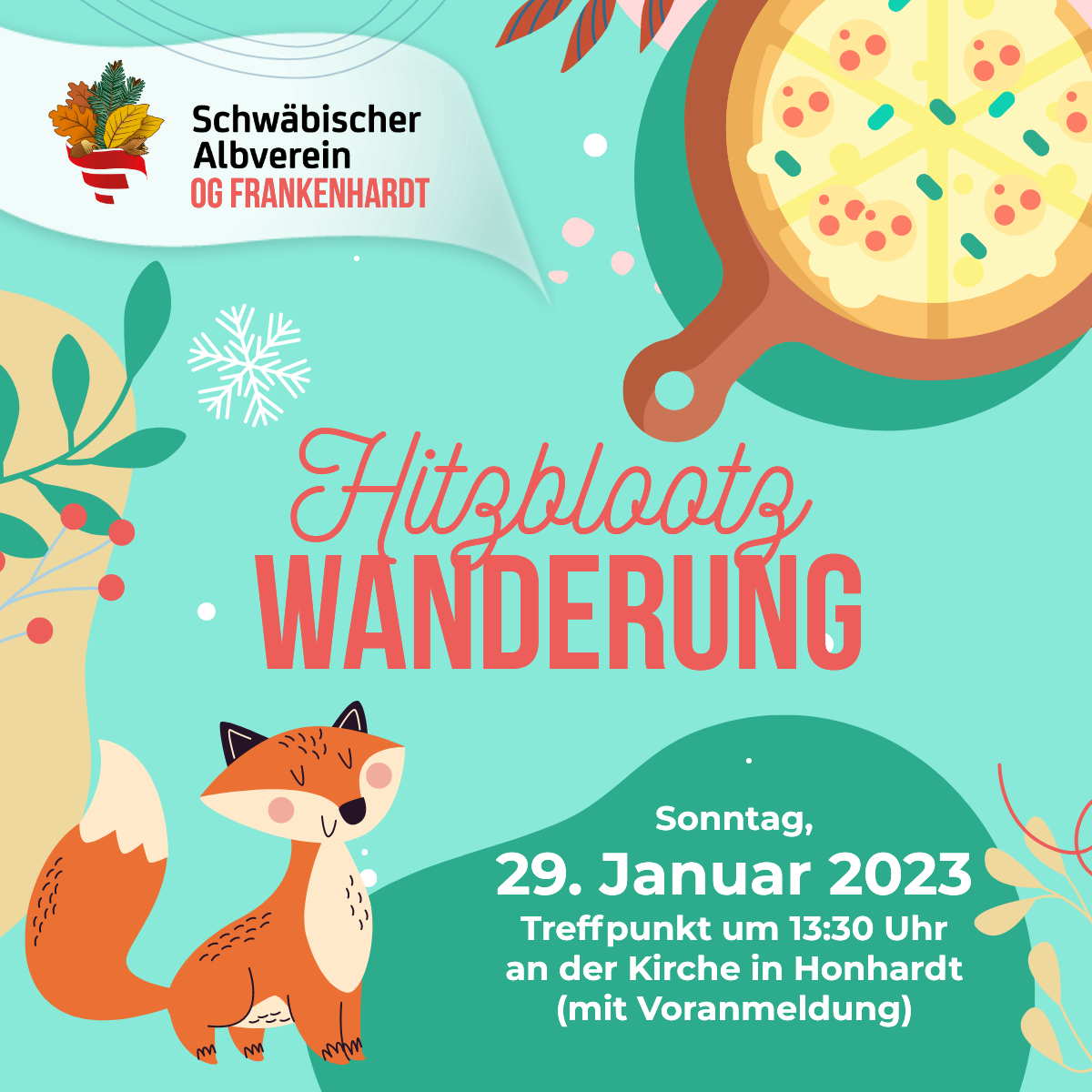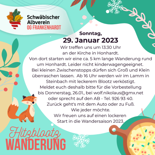 Hitzblootzwanderung So., 29.01.2023, Honhardt Uhrzeit: 13:30 - 17:30 Ort: Kirche Honhardt Schulstraße 4 74586 Honhardt iCalendar Mit dem Laden der Karte akzeptieren Sie die Datenschutzerklärung von Google.Mehr erfahren Karte laden Google Maps immer entsperren zur Übersicht