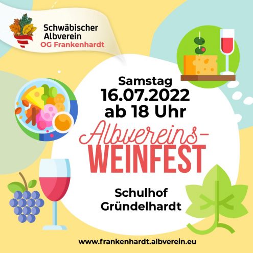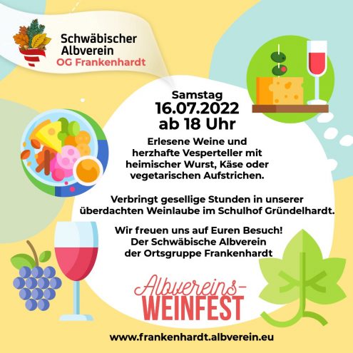 Das über Jahrzehnte hinweg bestens bekannte „Weinfest“ sorgt am Samstagabend für eine gemütliche Hocketse. In geselliger Atmosphäre mal probieren, welchen Wein man besonders mag, dazu lädt der Schwäbische Albverein Ortsgruppe Frankenhardt ein. Erlesene Weine und herzhafte Vesperteller aus heimischer Wurst, Käse oder vegetarischen Aufstrichen werden serviert.
